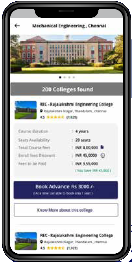 Booking a seat in Enrolin is easy. On your mobile Enrolin app, on home page, select your country, degree, educational stream, mode of study and preferred college location. Click search and voila! You have a list of colleges that you can browse through and select from. Enrolin app also offers personalized offers.